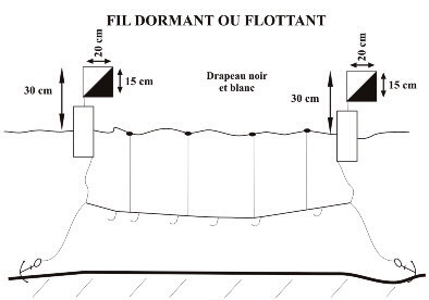 Le fil dormant est tendu perpendiculairement à la rive ; le navigateur ne devrait pas pouvoir l’observer pendant la période de protection des salmonidés.