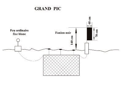 Le grand pic peut être tendu par coubles de 8 filets de 120 mètres au maximum ; dans ce cas le pavillon noir est séparé du feu ordinaire fixe blanc de près d’un kilomètre.