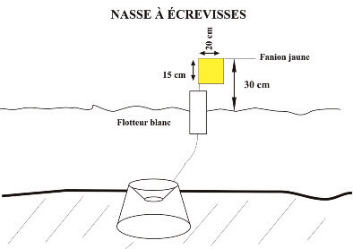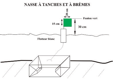 Les nasses sont signalées par des polets blancs surmontés d’un fanion ; la couleur des fanions permet de savoir à la capture de quelles espèces les nasses sont destinées : Blanc pour le poisson autre que les tanches et brêmes, Jaune pour les écrevisses et Vert pour les tanches et brêmes.