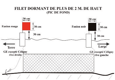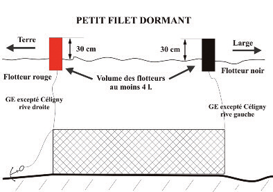 Dans les eaux genevoises, Céligny excepté, vu la proximité des rives, le polet rouge marquera le côté rive droite (Jura) du petit filet, le polet noir le côté rive gauche (Mont-Blanc) du même petit filet.