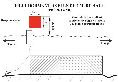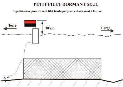Un petit filet seul, tendu perpendiculairement à la rive, peut être signalé au moyen d’un polet surmonté d’un pavillon rectangulaire rouge et noir situé côté terre du petit filet.